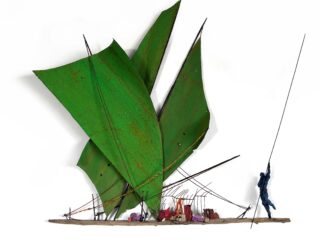 Laurent Chabolle assemble ses sculptures à partir de matériaux usés sur lesquels le temps a laissé sa marque. Des plaques de métal au vernis de rouille se compressent pour laisser apparaitre des paysages et des horizons ; des fins morceaux de bois se transforment en des coques sur les lesquelles se gonflent des voiles de tôle. La solitude émerge souvent avec majesté de ces paysages où l’individu est tantôt présent, tantôt manquant. Ces fragments de nature sont comme arrachés à leur monde d’origine mais se redéfinissent comme un tout autonome et suffisant. Ces sculptures témoignent d’une profonde adhésion au monde naturel dans toute sa diversité : des falaises en bord d’océan au plus rural des hameaux perdus en creux de vallée. Ses embarcations voguent quant à elles sur des eaux vides, posées en équilibre sur un océan d’absence. Sans autre but que le voyage, le voyageur muni de sa longue perche n’est plus qu’une ombre aux couleurs patinées qui n’existe que pour épouser la courbe des mâts et le sillage de son vaisseau.